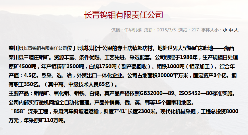 • 合作單位:長(zhǎng)青鎢鉬有限責(zé)任公司